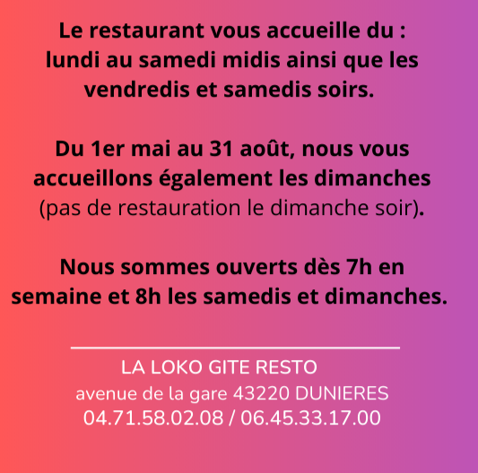 Le restaurant vous accueille du lundi au samedi midis ainsi que les vendredis et samedis soirs.