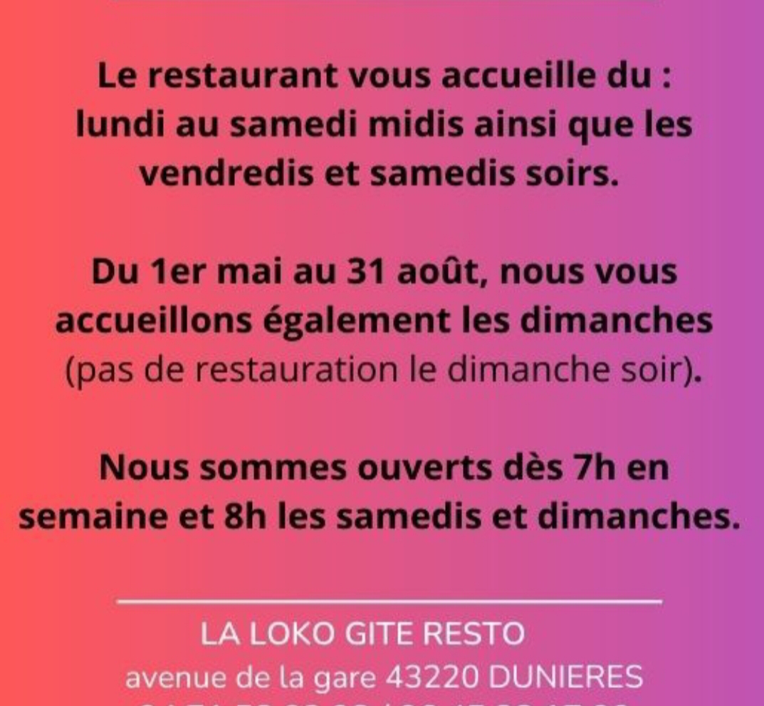 Gîte Resto La Loko - SARL PROVIDENCE au capital social de 5000€, inscrite au RCS du Puy en Velay sous le numéro SIRET 99986117200016.